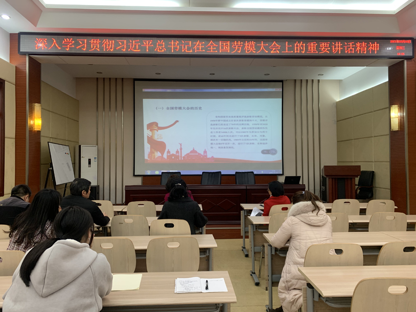会议深入学习贯彻习近平总书记在全国劳模大会上的重要讲话精神,组织全体教职工观看了全总研究室主任吕国泉《深入学习贯彻习近平总书记在全国劳模大会上的重要讲话精神》及全总研究室副主任李睿伟《准确把握劳模精神劳动精神工匠精神的科学内涵和实施要求》教学视频。学校党总支书记、校长黎敏强调,全体教职工要把习近平总书记重要讲话精神贯穿至各项工作中,大力宣传和弘扬“三个精神”,严守政治纪律、工作纪律,为学校发展出谋划策,贡献力量和智慧。