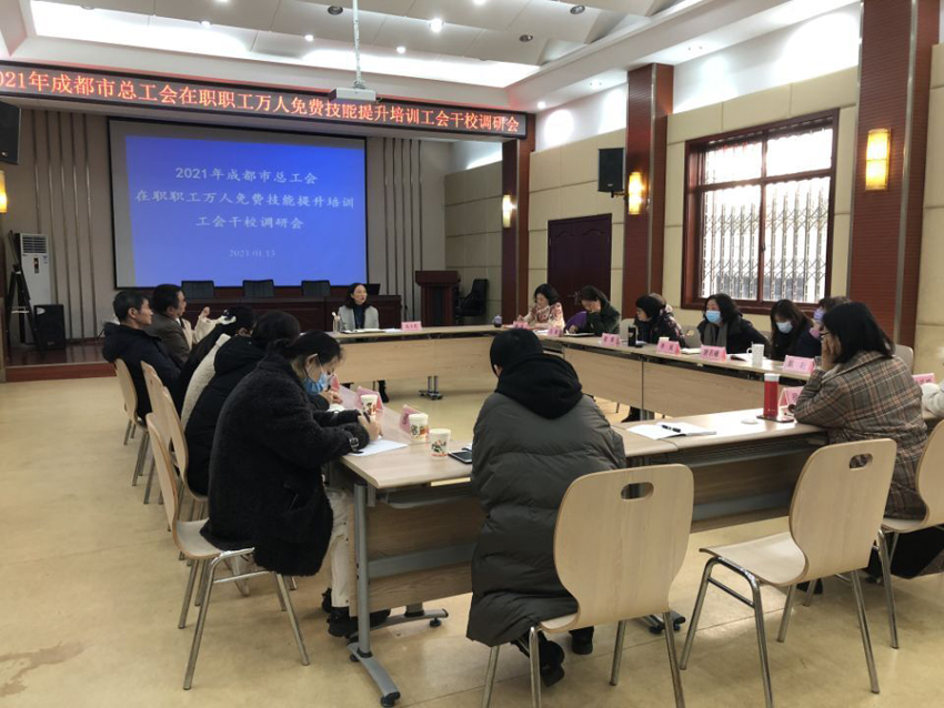 1月13日,市总工会党组成员、副主席高永虹到成都市工会干部学校调研、指导2021年成都市总工会在职职工万人免费技能提升培训工作,学校领导班子成员、中层干部、培训部老师参加调研。