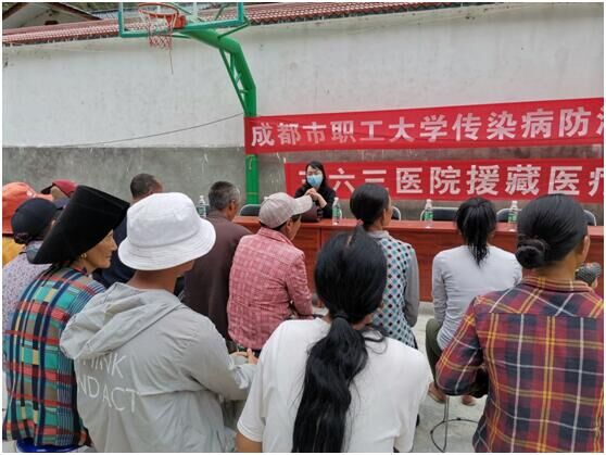 黎敏校长一行深入甘孜州九龙县朵洛乡,在女儿娃集中安置点和曲窝河坝集中安置点分别举办了《传染病防治科普讲座》。讲座由学校特别聘请的成都363医院主治医师郭洪礼主讲。郭医生就九龙县当地容易发病的鼠疫、结核病、包虫病、乙肝、艾滋病等五种重大传染疾病的防治做了重点讲解,同时也向村民介绍了新冠肺炎的预防方法。两个集中安置点共53名村民参与了培训。