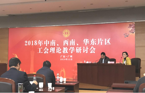 2018年12月15日-16日,中南、西南、华东片区工会理论教学研讨会在广东省总工会干部学校举行。共有85名片区工会院校的领导、教师和行政管理人员参加了会议。研讨会以“围绕工会十七大,立足新时代,展现新作为”为主题,以主题报告、专题发言、交流讨论、现场讲学等形式,交流分享了各地工会教育培训的成果,探讨新形势下劳动关系和工会工作中的有关理论与实践问题。
