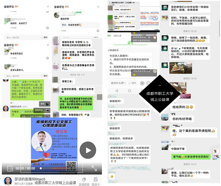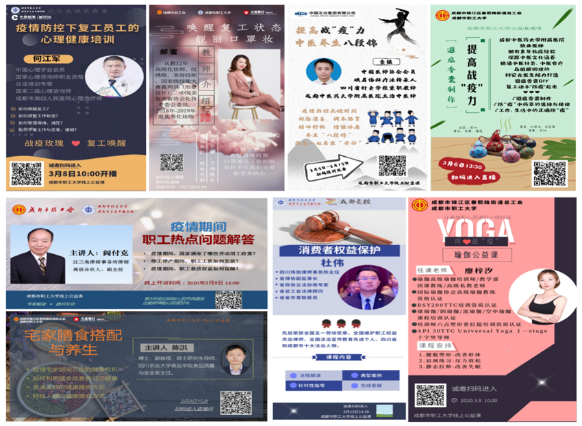 为认真贯彻落实习近平总书记在中央统筹推进新冠肺炎疫情防控和经济社会发展工作部署会议上的重要讲话精神,按照全总和省市总工会有关要求,成都市职工大学结合自身实际,创新新市民培训工作方式,以疫情防控不能懈怠、复工复产亦不容缓为工作标准,主动为职工群众防疫复工开设线上“云课堂”授课。主题广泛、内容丰富,有着较高质量的一系列线上公益课程受到广泛欢迎。