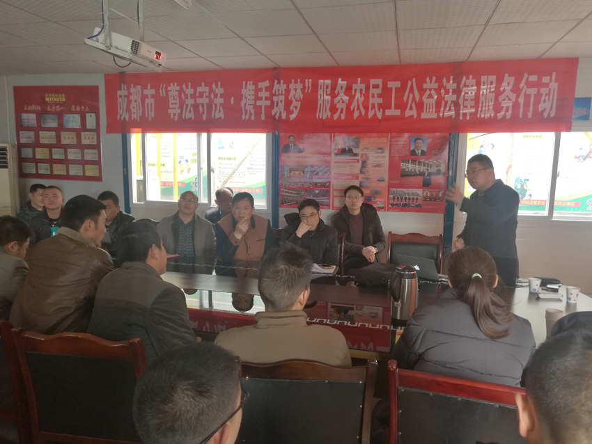 为进一步做好新形势下为农民工法律服务工作,推动解决农民工权益维护问题,促进劳动关系和谐和社会稳定,1月25日下午,由成都市总工会、成都市司法局、成都市律师协会联合组织开展的“尊法守法·携手筑梦”服务农民工公益法律服务行动在第二建筑工程公司绿地腾飞公馆项目部拉开帷幕,企业职工和农民工40余人参加活动。