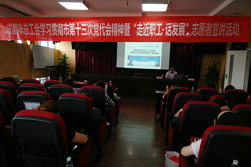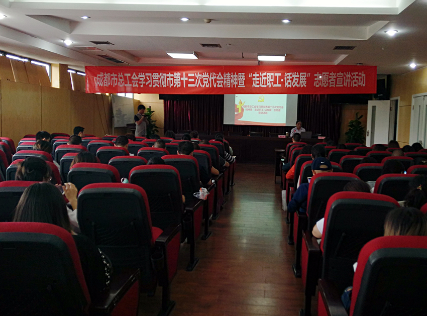 为深入学习宣传市第十三次党代会精神,贯彻落实市委重大工作部署,大力实施“职工思想引领行动”,弘扬劳模精神、劳动精神、工匠精神,引导职工听党话跟党走,积极投身加快建设全面体现新发展理念的国家中心城市的伟大实践,市总工会今年将在全市工会系统广泛组织开展学习贯彻党代会精神暨“走近职工•话发展”志愿者宣讲活动,活动由市职工大学(工会干部学校)承办。5月23日宣讲团走进温江,向社区两委和一线工会干部宣讲党代会精神,共话成都发展。