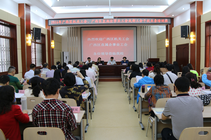 2016年5月9日上午,广西区机关工会 广西区直属企事业工会成都工会干校业务培训班开班仪式在我校一楼多功能厅顺利举行,广西区机关及企事业单位工会主席共62人参加了培训班。广西区直属企事业工会常务副主任马宁、广西区直属企事业工会调研员张淑荣、成都市工会干部学校副校长彭晓丽出席开班典礼并讲话。