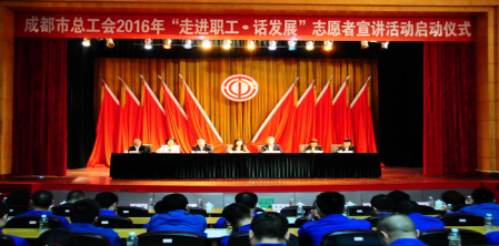 为深入学习宣传党的十八届三中、四中、五中全会精神、习近平总书记系列重要讲话精神和“十三五”规划目标任务,推动中央、省委和市委精神走进职工,充分发挥工会组织在职工思想引领方面的重要作用,4月8日上午,成都市总工会2016年“走进职工·话发展”志愿者宣讲活动启动仪式在成都印钞公司举行。市总工会党组书记、常务副主席冷晓燕,市总工会副主席、党组成员陈聪,成都印钞公司董事长张萌,党委书记王绍法,工会主席曾丽出席了启动仪式,公司400余名职工参加了启动仪式。启动仪式上,王绍法代表成钞公司致词,陈聪代表市总工会作了讲话。